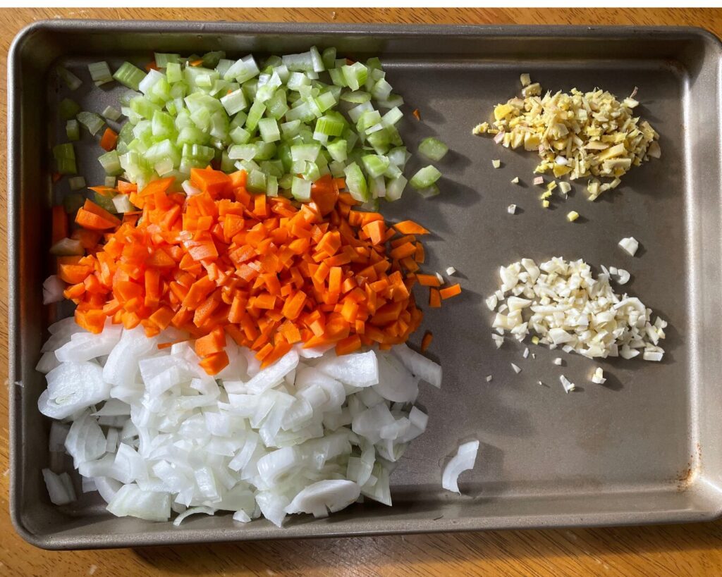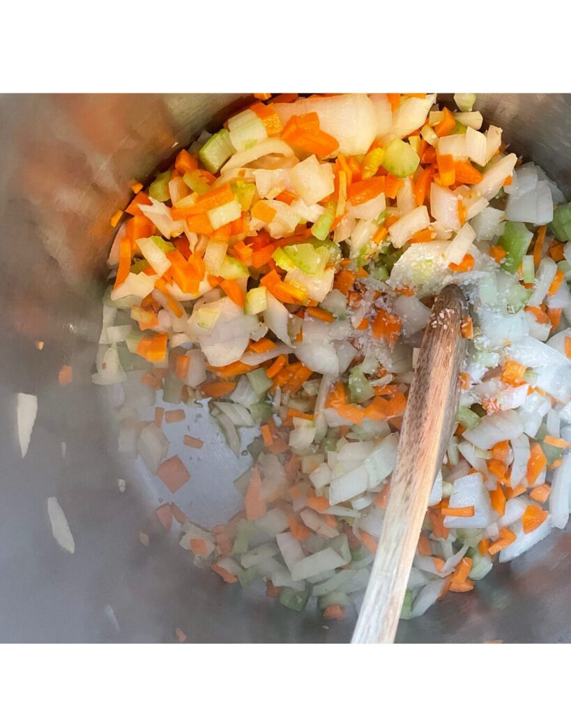 • 野菜類を全部とひとつまみの塩も加えて、たまねぎがきつね色になるまで